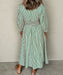 This Green Stripe Cinched Midi Dress features a flattering V-neckline and a convenient zip front closure for easy wear. Its high, cinched waist beautifully defines your silhouette, while the stylish stripes add a modern, trendy touch to your outfit. Perfect for effortless chic on any occasion.