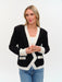 The Liv Asymmetrical Cardigan brings together style and comfort in one effortless piece. Its striking black base with crisp white trim and elegant gold buttons creates an instantly polished look, while the soft eyelash fabric feels wonderfully cozy against your skin. The asymmetrical opening adds modern flair, and faux pockets keep the silhouette sleek. Layer it over anything for a sophisticated touch that doesn't compromise on warmth or wearability.