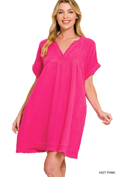Swing into summer with our Short Sleeve Double Gauze Raw Edge Dress! Made with a soft and breathable double gauze fabric, this V-neck dress is perf...