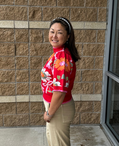 Brighten your wardrobe with this charming short sleeve floral print sweater. The vibrant red base pairs beautifully with delicate floral details, c...