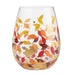 This stemless wine glass by Lolita is 20 oz of autumn charm. Covered in falling leaves, this hand-painted glass enchants with fall colors of red, orange, and yellow. Embrace the changes of the season and sip in style.