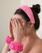 Wristbands are ultra-absorbent & designed to stop the flow of water down your arms as you do your AM/PM skincare routine. No more wet counters, no more wet sleeves! Fluffy headband keeps hair pulled back & out of your face