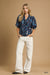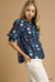 This navy floral top is your go-to for laid-back sophistication. The V-neck with ruffled trim creates a flattering neckline, while puff sleeves add a touch of whimsy without compromising comfort. The smocked and ruffled placket brings textural interest and movement to the front. Designed for those who appreciate effortless style, this piece works beautifully with jeans, skirts, or trousers for a polished yet relaxed look.